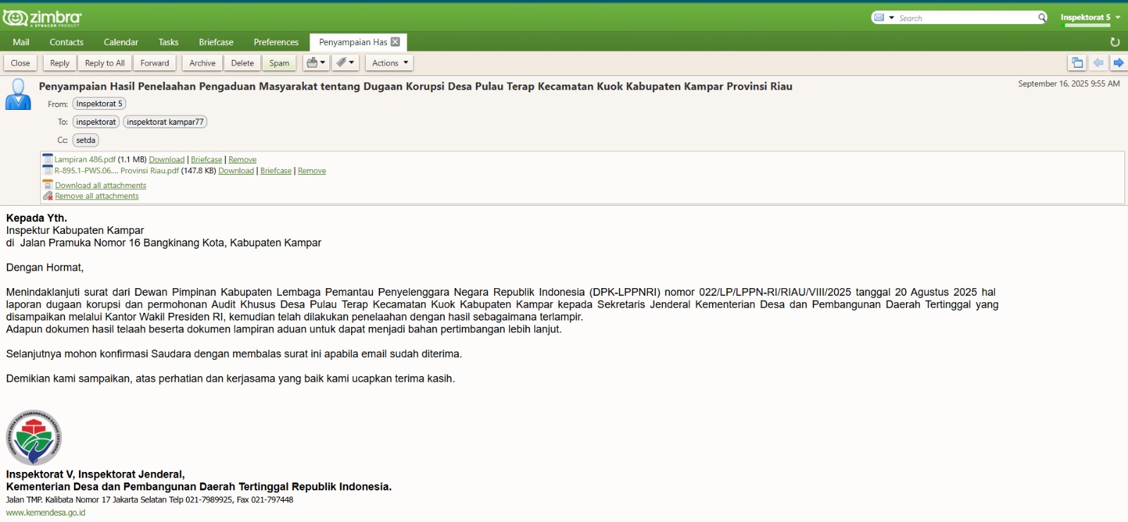 Kementerian Desa dan Pembangunan Daerah Tertinggal (Kemendes PDT) Yandri Susanto melalui, Sekretaris Jenderal Taufik Madjid, S.Sos., M.Si, Rabu 17 September 2025 membenarkan bahwasanya kemendes sudah melayang surat ke Inspektorat Kabupaten Kampar terkait dugaan korupsi Desa Pulau Terap.