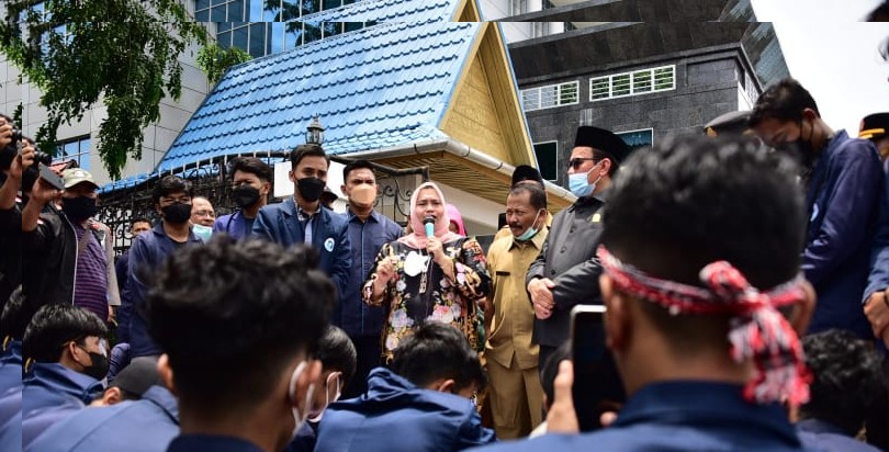 Bupati Bengkalis Kasmarni, Bersama Ketua DPRD Bengkalis H. Khairul Umam, Kapolres Bengkalis AKBP Indra Wijatmiko, Dandim 0303 Bengkalis Letkol inf Endik Yunia, Ketua Pengadilan Agama Bengkalis Hasan Nul Hakim, langsung berdiri di hadapan ratusan mahasiswa.